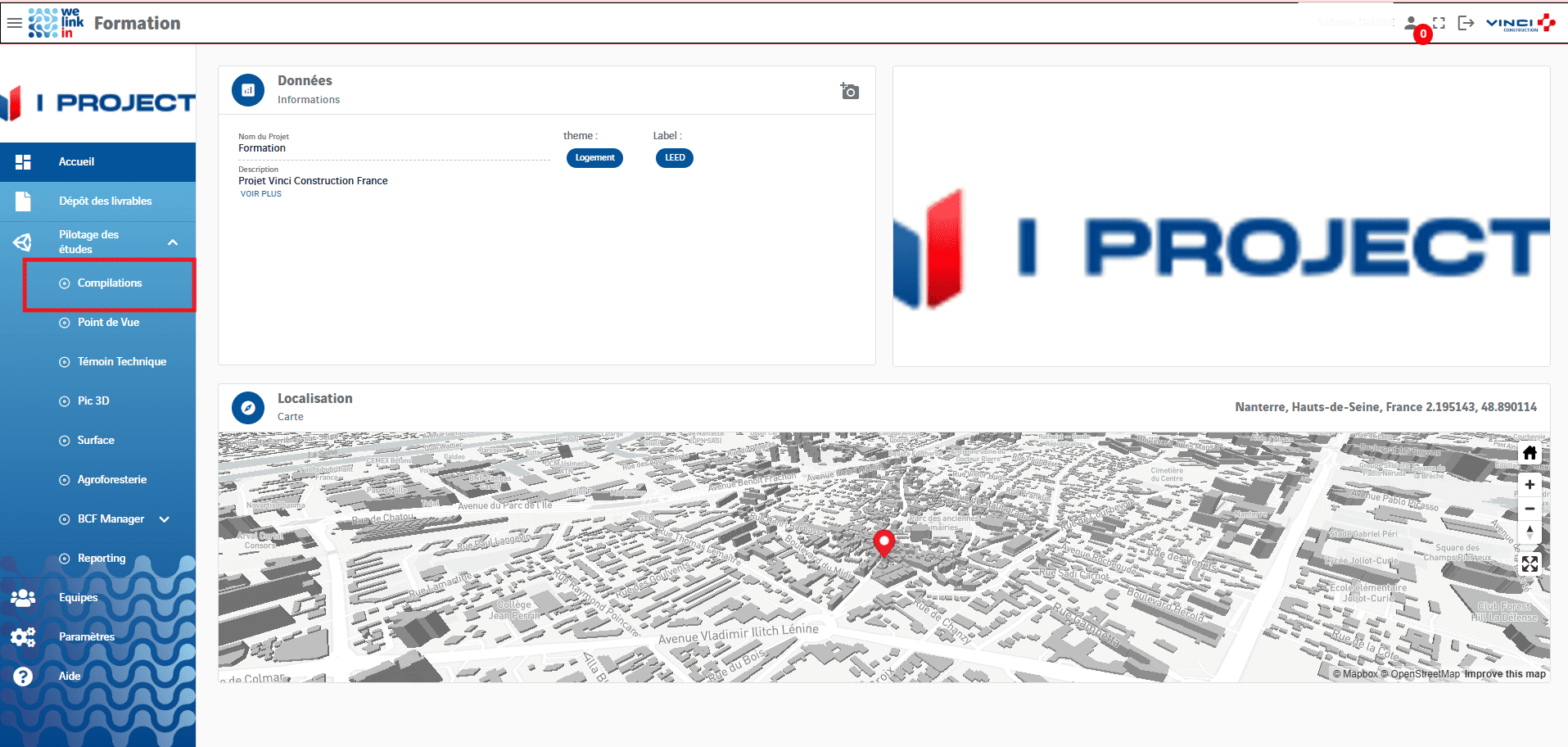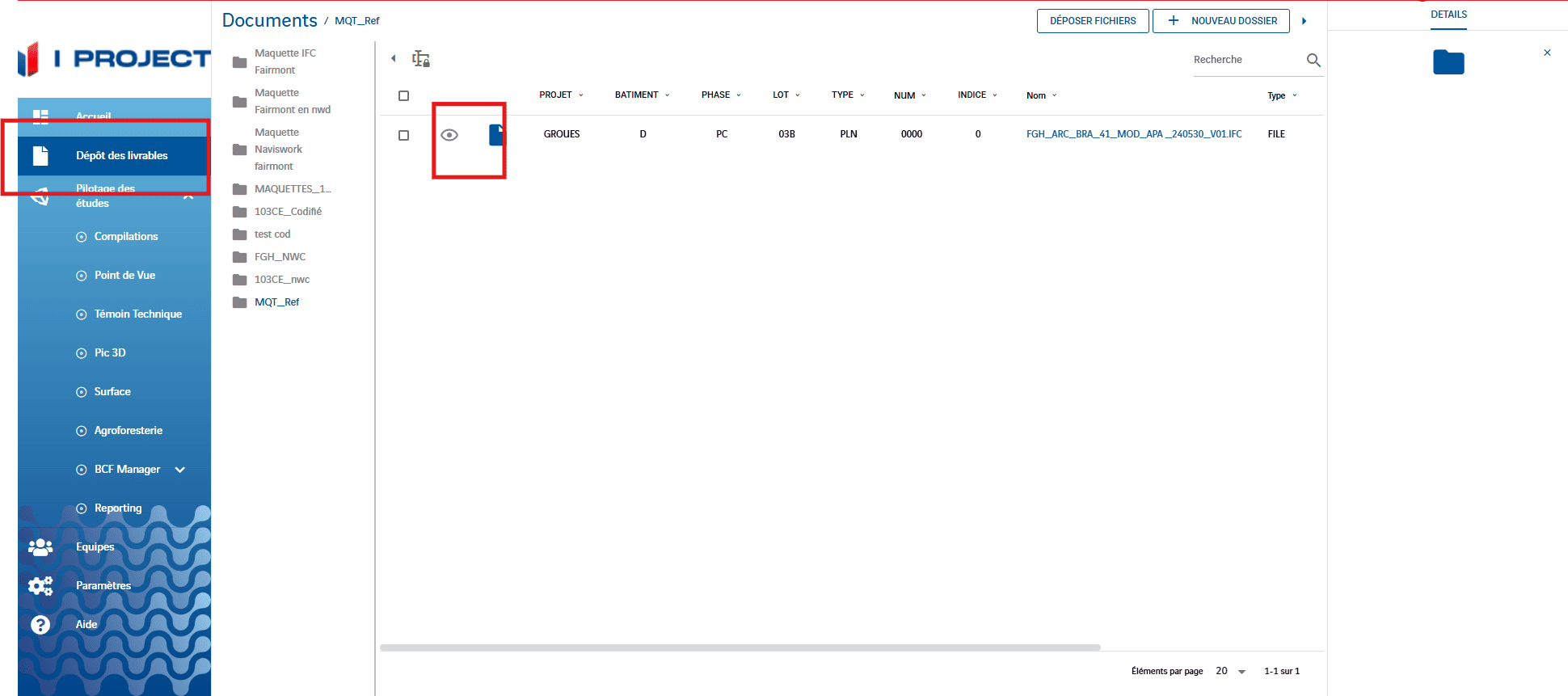 La visionneuse permet d’afficher et d’interagir avec les maquettes 3D importées dans la plateforme. Après avoir stocké vos fichiers dans l’onglet « Dépôt de livrables », vous pouvez visualiser la maquette en cliquant sur l’icône Vue située à gauche.
