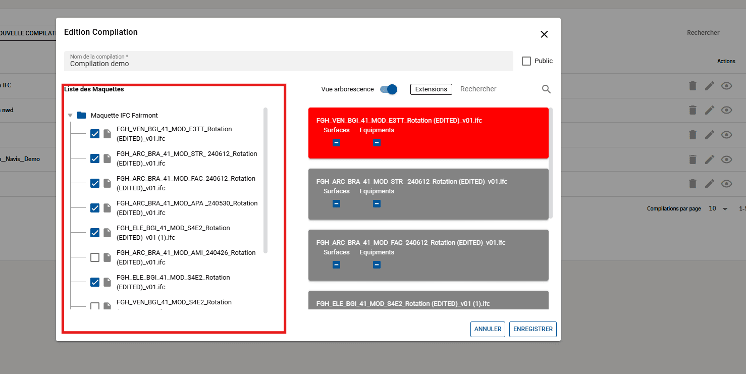 Par défaut, seules les maquettes aux formats IFC et Revit sont affichées dans la fenêtre de compilation.