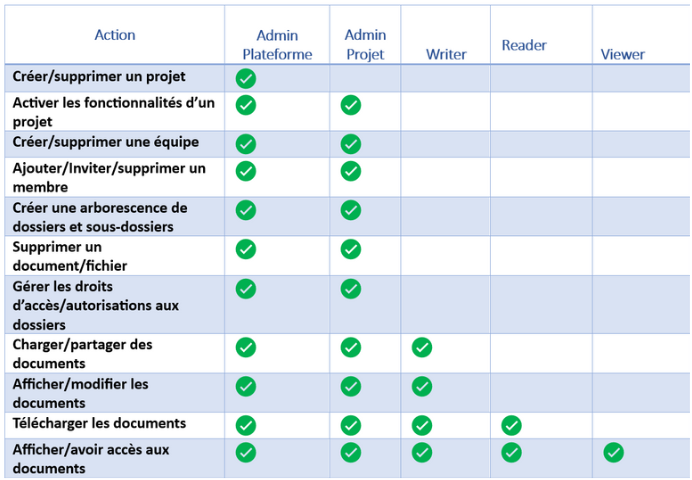 Le Tableau ci-dessous détaille les permissions de chaque rôle.