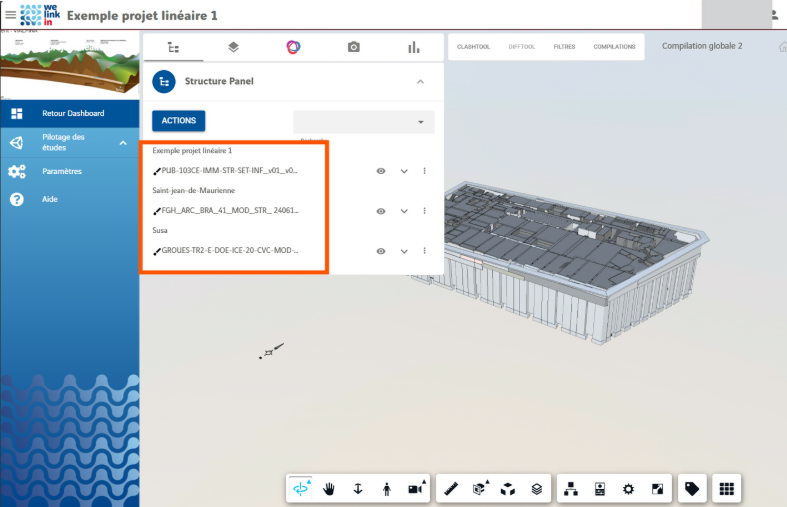 Lorsque vous créez une compilation globale, vous pouvez visualiser, dans le Structure Panel, les sous-projets d’origine des maquettes intégrées. Vous avez également la possibilité de créer des BCF directement sur cette compilation globale.