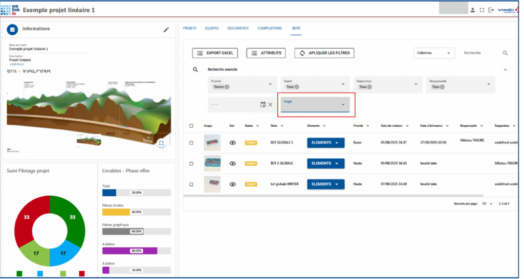 ans l’onglet BCF, vous pouvez consulter l’ensemble des BCF créés à partir des compilations globales, ainsi que filtrer les BCF par sous-projet.