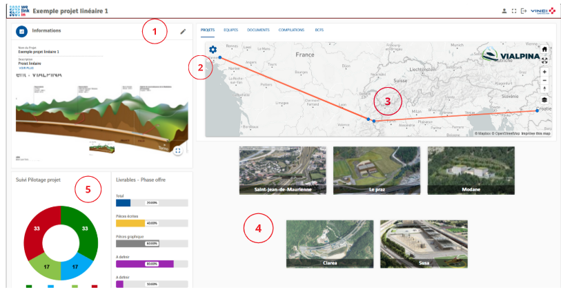 Ce portail permet de créer des projets intégrant les différentes parties du tracé, accessibles depuis une carte interactive. Il offre une gestion globale des droits d’accès, du répertoire documentaire, des compilations de maquettes et des reportings de suivi des études, ainsi que les revues de synthèse études et la gestion et suivi des conflits.